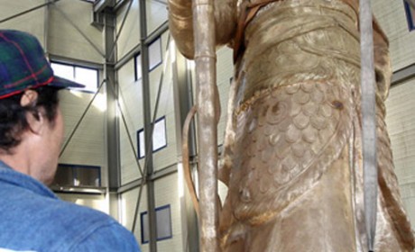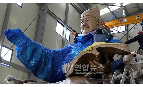이천 도착한 이순신 장군 동상(이천=연합뉴스) 신영근 기자 = 14일 오후 42년만에 대대적인 수리를 위해 서울 광화문을 떠나 경기도 이천시 설성면 수산리 '공간미술'에 도착한 이순신 장군 동상의 포장을 공간미술 직원들이 벗겨내고 있다. 2010.11.14 d…