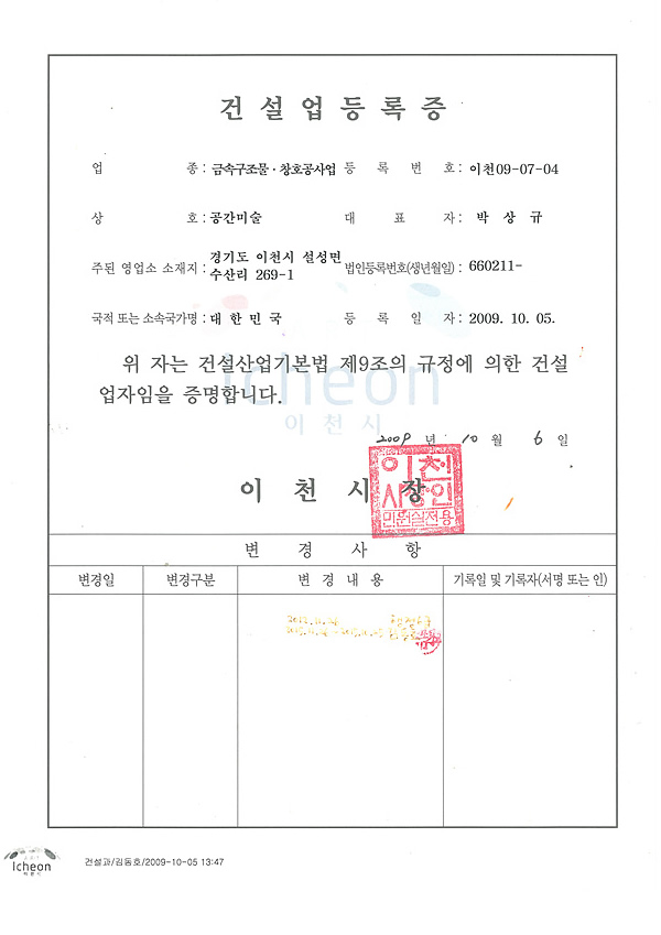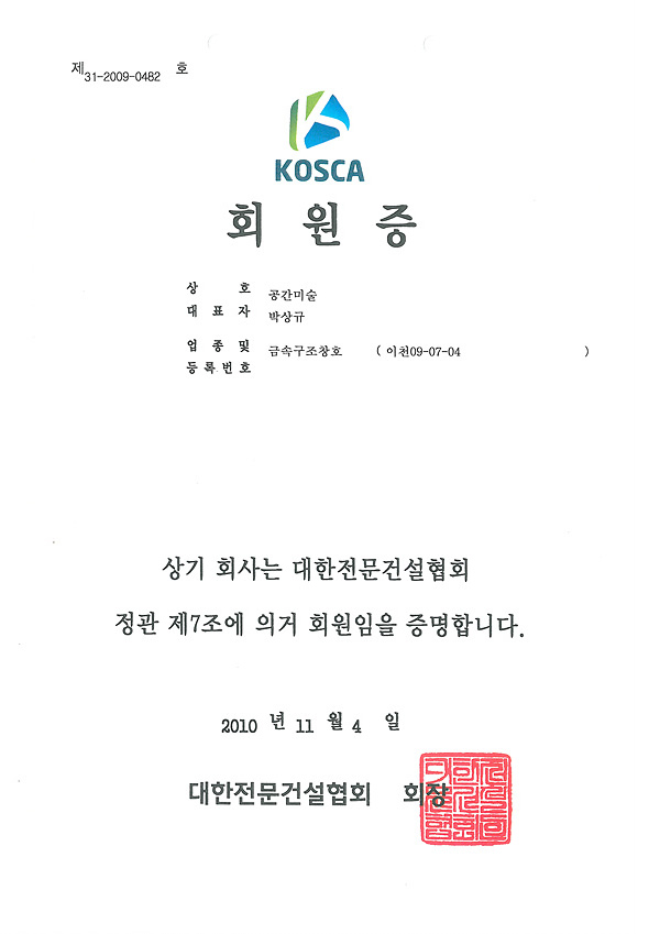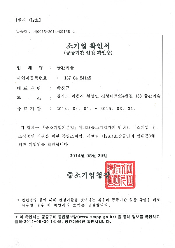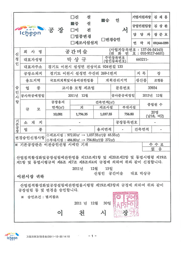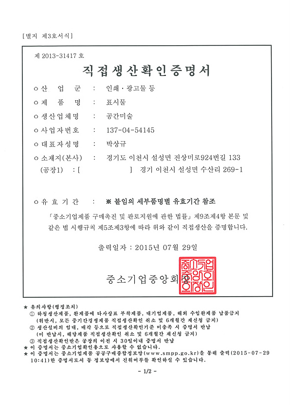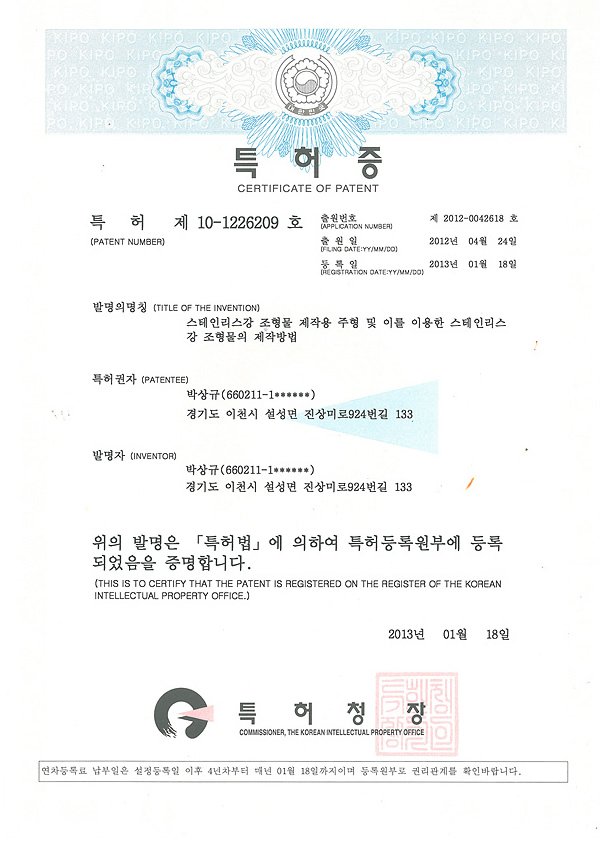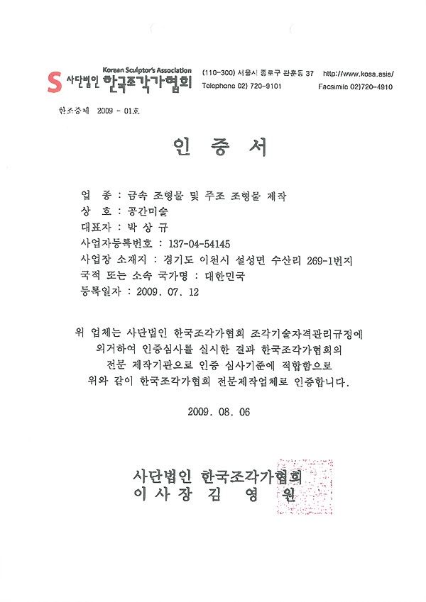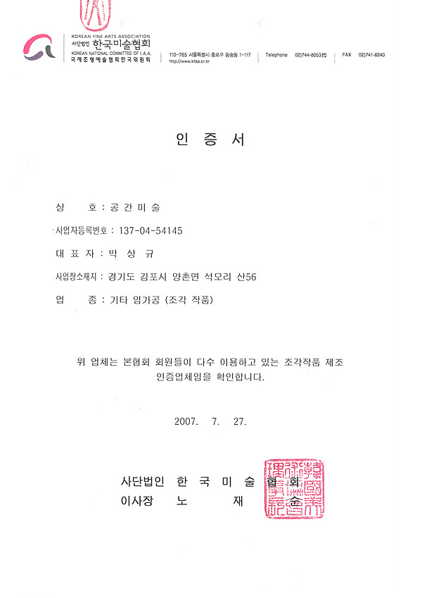 라이센스 라이센스 이미지를 클릭하시면 자세히 보실수 있습니다. × 한국미술협회 인증서 × 한국조각협회 인증서 × 동상제조 특허증 × 스텐제작 특허증 × 산업디자인 전문회사 신고필증 × 직접생산확인증명서(실물모형) × 직접생산확인증명서(조형물) × 대한전문건설협회 회원증 × 공장등록증 × 건설업등록증 × 사업자등록증 × 소기업확인서