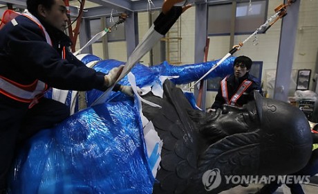 이천 도착한 이순신 장군 동상(이천=연합뉴스) 신영근 기자 = 14일 오후 42년만에 대대적인 수리를 위해 서울 광화문을 떠나 경기도 이천시 설성면 수산리 '공간미술'에 도착한 이순신 장군 동상의 포장을 공간미술 직원들이 벗겨내고 있다. 2010.11.14 d…